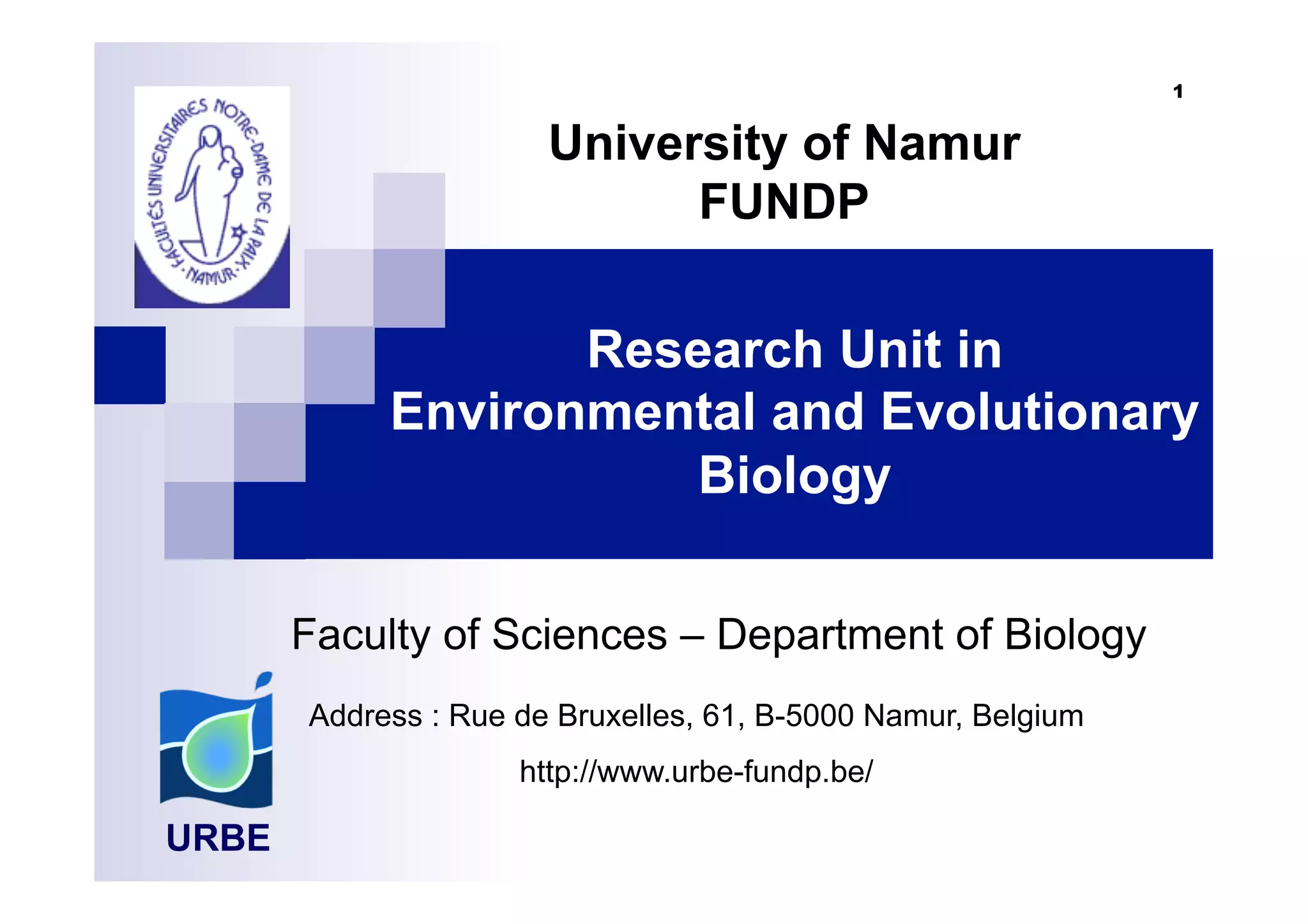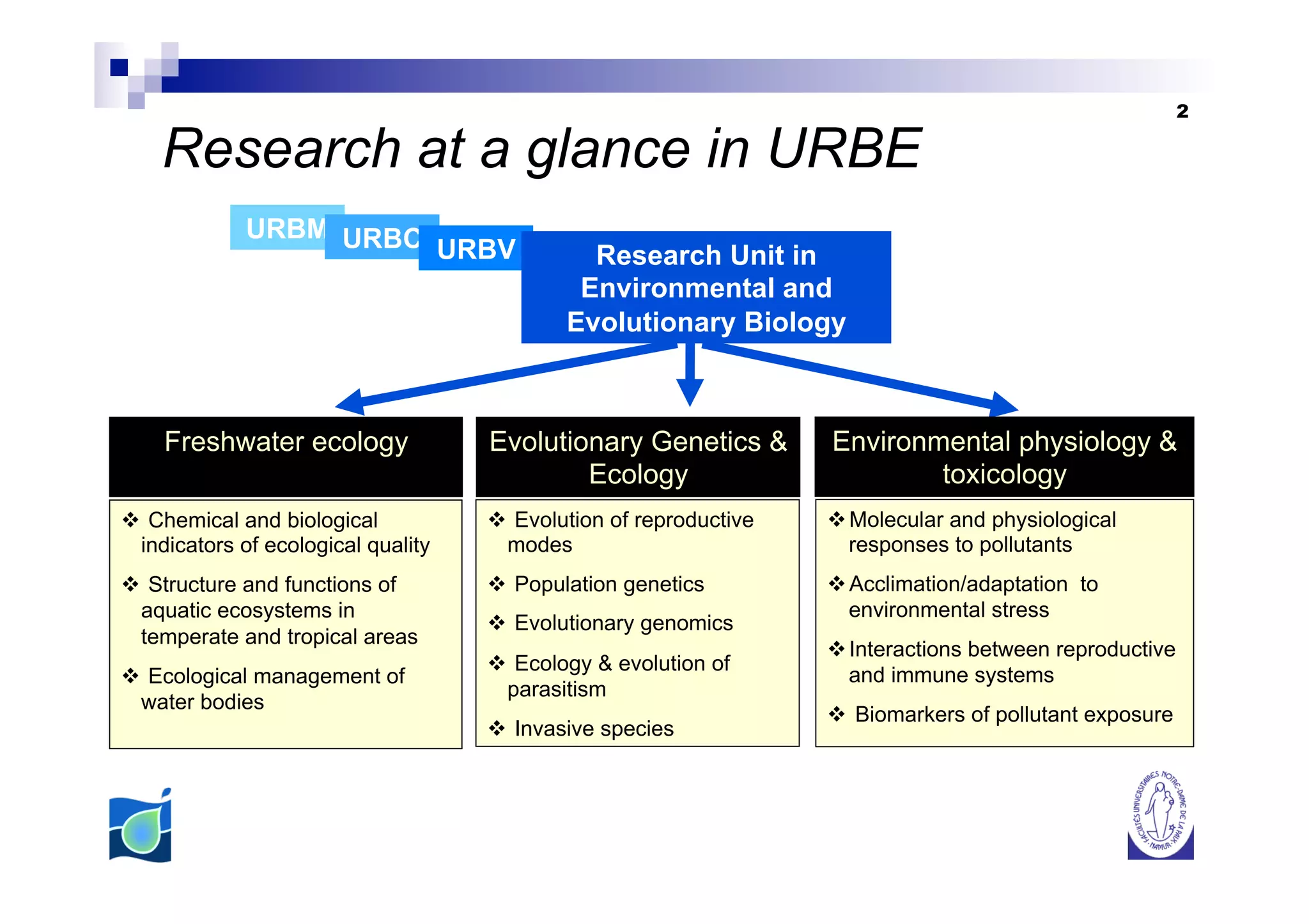 The URBE research unit studies environmental and evolutionary biology through three main areas of research: freshwater ecology, evolutionary genetics and ecology, and environmental physiology and toxicology. The unit has 33 staff members including 17 PhD students and 7 senior researchers. Research is conducted at different organizational levels from genes to entire ecosystems. Projects include studies of aquatic ecosystems, population genetics of invasive species, and the physiological responses of organisms to pollutants and environmental stressors.