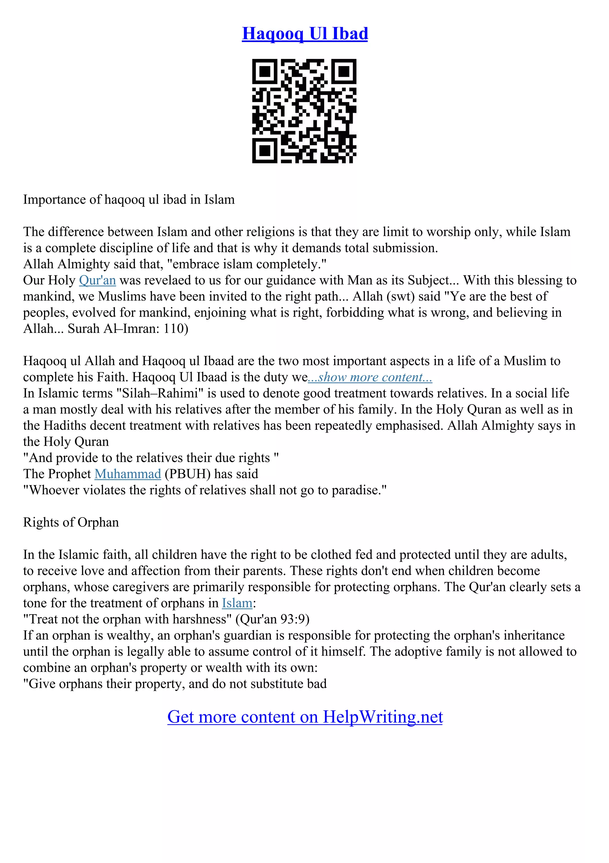 The document discusses the importance of haqooq ul ibad (duties towards other people) in Islam. It states that Islam demands total submission and is a complete way of life, not just limited to worship. It emphasizes treating relatives, orphans, and others with kindness and respecting their rights as outlined in the Quran and hadith. The Quran instructs Muslims to be the best community by enjoining good and forbidding evil. Haqooq ul ibad involves showing good treatment to relatives, protecting orphans and their inheritance, and not mistreating anyone.