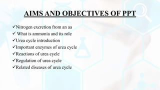 The document summarizes the metabolism of proteins and amino acids, focusing on the urea cycle. It describes how amino acids are broken down to remove nitrogen, producing ammonia. Ammonia is highly toxic, so the liver uses the urea cycle to convert ammonia to urea for excretion. The urea cycle involves 5 enzymatic reactions that occur in the liver mitochondria and cytosol. Defects in urea cycle enzymes can cause hyperammonemia, which can be fatal if not treated.