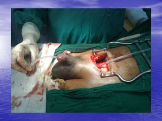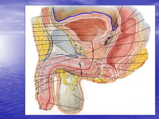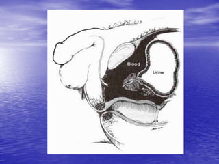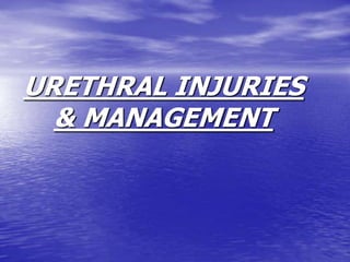Urethral and bladder injuries can occur from pelvic fractures or direct trauma. Posterior urethral injuries commonly occur from shearing forces in pelvic fractures and require initial suprapubic cystostomy with delayed repair to avoid complications. Anterior urethral injuries from straddle injuries may be contusions or lacerations, treated with catheterization or cystostomy depending on severity. Bladder injuries are often extraperitoneal from pelvic fractures and present as hematuria, diagnosed by cystography or CT cystography and treated with catheter drainage. Intraperitoneal bladder injuries require surgery.
