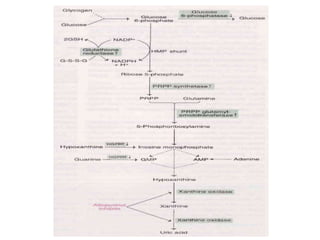 Uric acid is the end product of purine metabolism and is excreted in urine. It is produced from the breakdown of purines from food and cells. There are two main methods for determining serum uric acid levels - the Caraway method which uses phosphotungstic acid and measures absorbance at 700nm, and the enzymatic method using uricase and peroxidase to produce a colored product measured at 500-540nm. Normal serum uric acid levels are 3.5-7.2 mg/dl for males and 2.5-6.2 mg/dl for females. Hyperuricemia can be caused by reduced excretion due to renal disorders or increased production from metabolic disorders and diseases