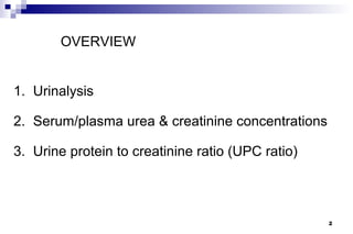 Urinalysis provides important information about renal and lower urinary tract function through evaluation of urine properties such as specific gravity, sediment, biochemical analysis, and culture. Specific gravity measures the kidney's ability to concentrate urine and is assessed through refractometry. Biochemical urine strips can detect substances like glucose, bilirubin, ketones, blood, pH, protein, and nitrites which may indicate underlying conditions. Serum urea and creatinine levels reflect glomerular filtration rate, with elevated levels indicating azotaemia and potentially uraemia.