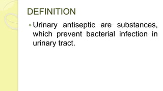 This document discusses urinary antiseptics, which are substances that prevent bacterial infections in the urinary tract. It outlines two common urinary antiseptics - metenamine and nitrofurantoin. Methenamine works by hydrolyzing in acidic urine to form ammonia and formaldehyde, which are bactericidal. It is used to treat chronic urinary infections. Nitrofurantoin is a synthetic antibiotic that works by interfering with bacterial cell metabolism and wall formation. It is commonly used to prevent recurrent urinary tract infections. Both drugs can cause adverse effects like diarrhea, vomiting, and allergic reactions, so nurses must monitor patients taking these medications.