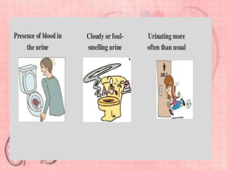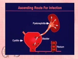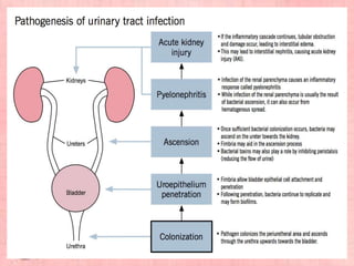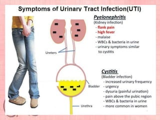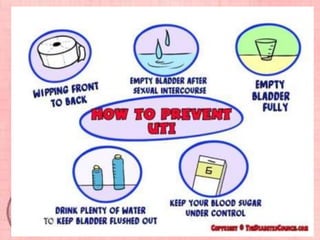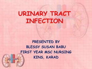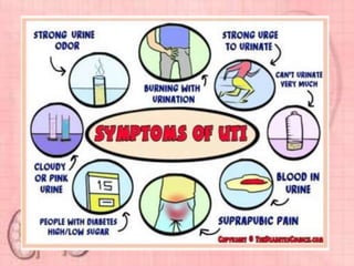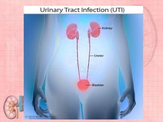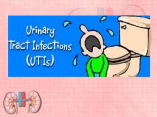 This document provides information about urinary tract infections (UTIs). It begins with an introduction to UTIs, noting they are common and usually responsive to antibiotics. The document then covers classification of UTIs, risk factors, symptoms, diagnostic tests, treatment including antibiotics, and complications. It also provides details on specific types of UTIs like cystitis, urethritis and pyelonephritis. The document concludes with a section on renal calculi/kidney stones, discussing causes, types, diagnosis and treatment.