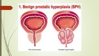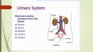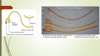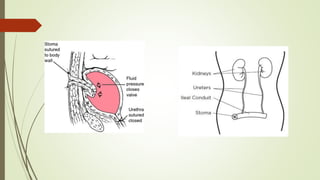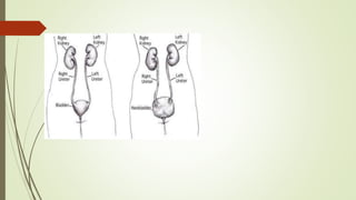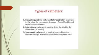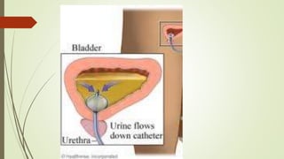 Urinary elimination involves the removal of waste from the body through the urinary system. Urine is produced in the kidneys and stored in the bladder, and the desire to void occurs when the bladder reaches a certain capacity. Normal urine production is influenced by many developmental, physiological, pathological, dietary, and lifestyle factors. Abnormalities in urinary elimination can include increased/decreased urine output, pain/difficulty urinating, or incontinence. Nursing care focuses on regular voiding schedules, bladder training, skin care, and addressing any underlying causes.