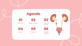 El sistema urinario es el principal sistema excretor del cuerpo, encargado de filtrar la sangre, eliminar desechos y regular la composición química de la sangre. Funciona a través de un proceso de tres etapas: filtración, reabsorción y excreción, implicando principalmente a los riñones y a otros componentes como los uréteres, la vejiga y la uretra. Este sistema puede verse afectado por diversas enfermedades, incluyendo infecciones del tracto urinario, cálculos renales y cáncer de vejiga, que requieren diagnósticos y tratamientos específicos.