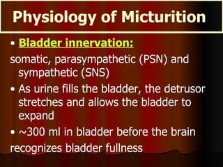This document discusses incontinence of urine, including the physiology of micturition, definitions of different types of incontinence, and methods for diagnosing and treating stress incontinence. It defines stress incontinence as the involuntary escape of urine with increased intra-abdominal pressure, such as during coughing or sneezing. Diagnostic tests include stress tests, cystourethrography, and urodynamics to differentiate between urethral hypermobility and intrinsic sphincter dysfunction as causes. Treatment options include pelvic floor exercises, pessaries, bladder neck slings or colposuspension surgery.