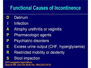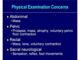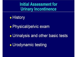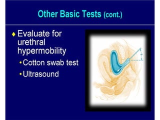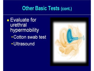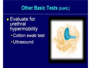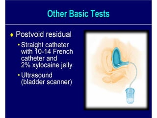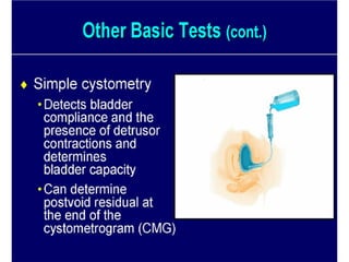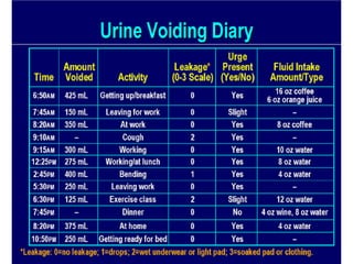 Voiding diaries are used to record fluid intake amounts and types as well as voiding or urination frequency and volumes to assess bladder function. Patients keep track of what and how much they drink along with how often and how much they urinate.