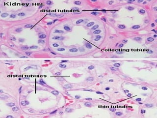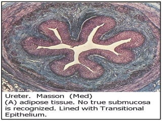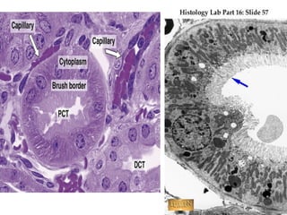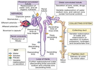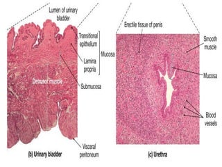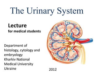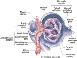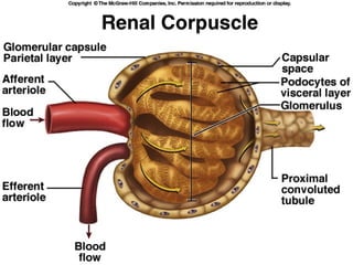 The urinary system consists of the kidneys, ureters, urinary bladder, and urethra. The kidneys contain millions of nephrons, which are the functional filtering units. Each nephron contains a renal corpuscle with glomerulus and Bowman's capsule, where blood is filtered, and a renal tubule with various segments that modify the filtrate and produce urine. The ureters carry urine from the kidneys to the bladder. The bladder stores urine until urination, when urine exits the body through the urethra. The urinary system removes wastes and regulates fluid and electrolyte balance.