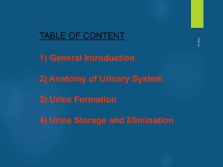 The document provides an overview of the urinary system, including its anatomy and functions. Some key points: