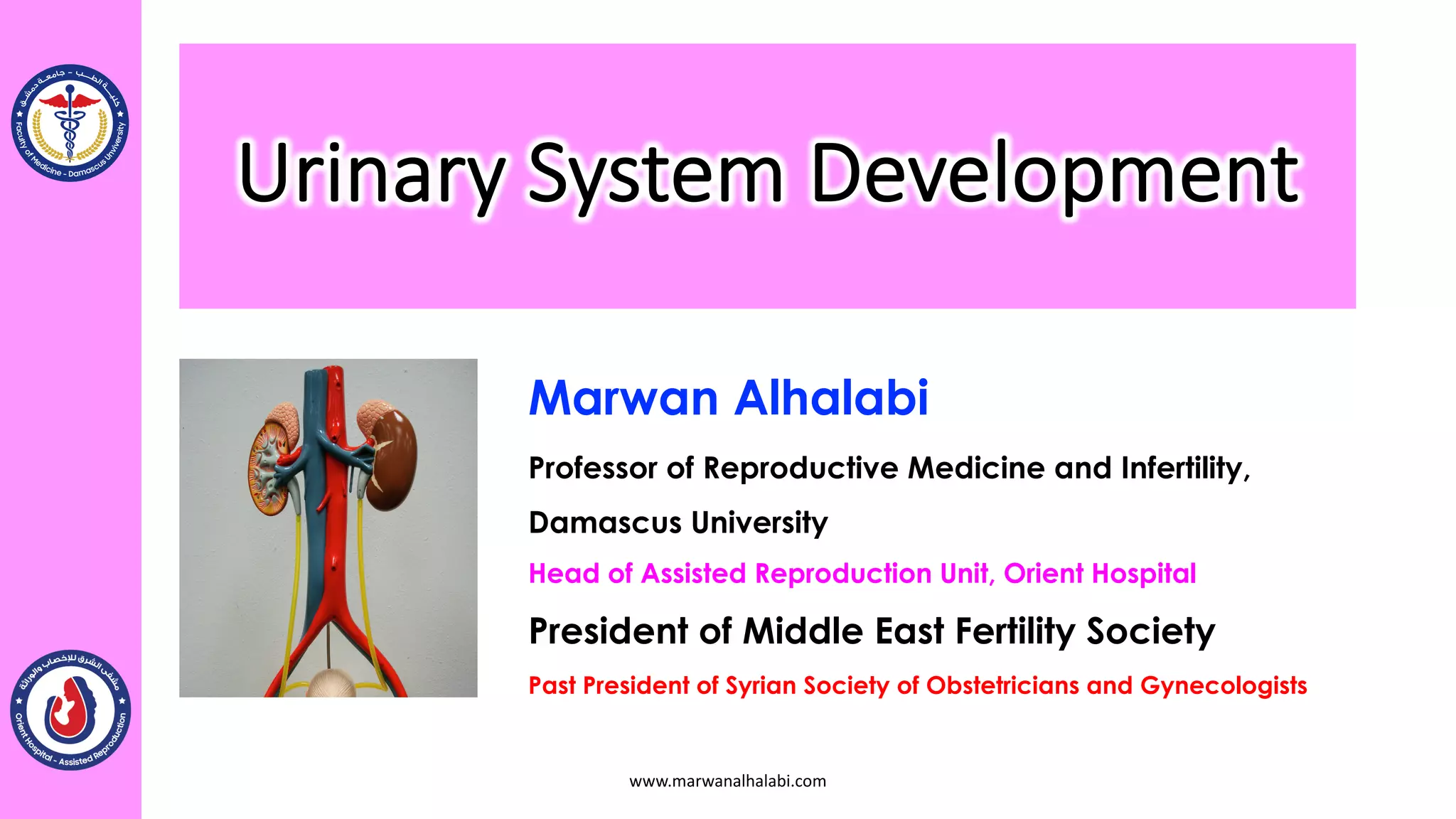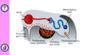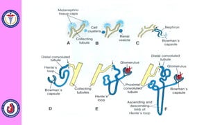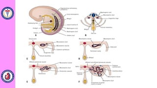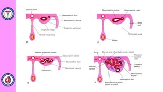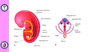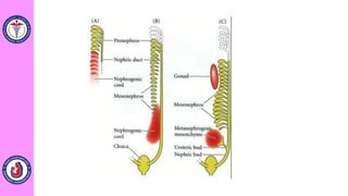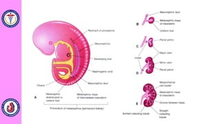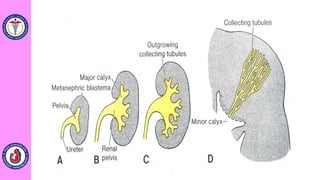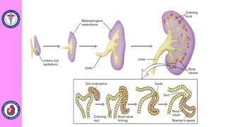 The urinary system develops from the intermediate mesoderm and includes three successive kidney structures - the pronephros, mesonephros, and metanephros. The metanephros forms the permanent kidneys. It develops from the ureteric bud penetrating the metanephric mesoderm and inducing nephron formation. The kidneys ascend into the abdominal cavity during development and become fully functional by 12 weeks of gestation. The urinary bladder and urethra also develop from the intermediate mesoderm through partitioning of the cloaca.