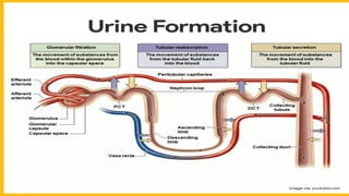 The urinary system, primarily functioning through the kidneys, filters blood, processes waste, regulates fluid balance, and converts vitamin D. It comprises two kidneys, ureters, a bladder, and a urethra, each with specific structural features and roles in urine formation and transport. Age-related changes affect kidney function and bladder capacity, making it essential to monitor urinary health in older adults.