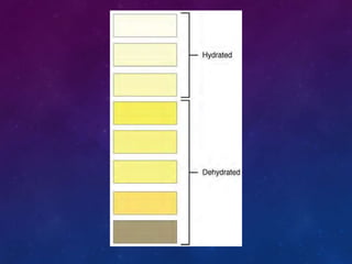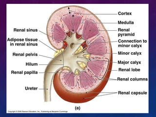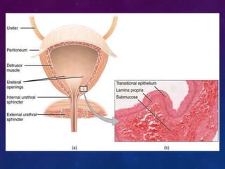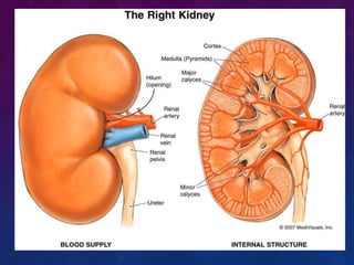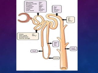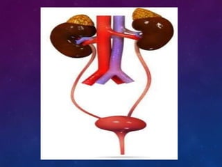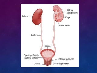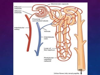 The urinary system consists of the kidneys, ureters, bladder, and urethra. The kidneys filter waste from the blood to produce urine, regulate electrolytes and acid-base balance, and control blood pressure. The nephron is the functional unit of the kidney that filters blood to form urine via glomerular filtration, reabsorption of nutrients, and secretion of wastes. Urine is transported from the kidneys to the bladder via the ureters for storage and later excretion through the urethra.