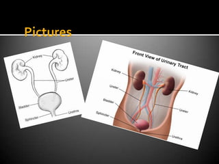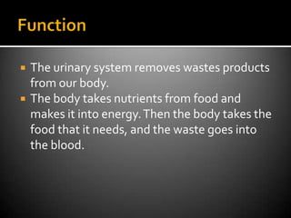 The urinary system removes waste from the body through the kidneys, ureters, bladder, and urethra. The kidneys filter waste from the blood to produce urine, which travels through the ureters to the bladder. The bladder stores urine until it is released through the urethra. The urinary system works with other body systems like the circulatory, nervous, and muscular systems to effectively regulate fluids and expel waste from the body.