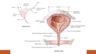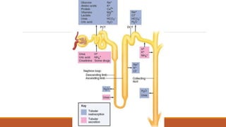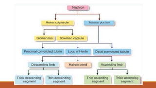 The urinary system works to filter waste from the blood and excrete it as urine. It includes the kidneys, ureters, bladder, and urethra. The kidneys contain millions of nephrons, which are the functional filtering units. Blood is filtered through nephrons, and the resulting glomerular filtrate undergoes reabsorption and secretion processes to form urine, which is stored in the bladder and expelled through the urethra. The urinary system helps regulate water balance, electrolyte levels, acid-base balance, and blood pressure.