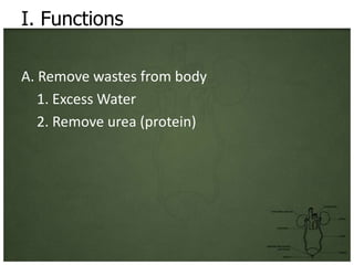 The excretory system removes waste from the body through the kidneys, ureters, urinary bladder, and urethra. The kidneys contain millions of nephrons that filter blood to remove urea and excess water, producing 180 liters of fluid per day. The ureters carry urine from the kidneys to the urinary bladder for temporary storage, and then the urethra removes urine from the body. Common diseases of the excretory system include diabetes, urinary infections, kidney stones, and kidney failure.