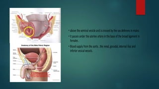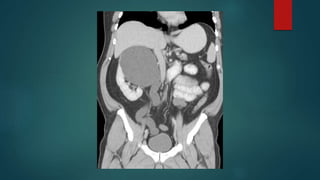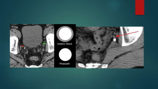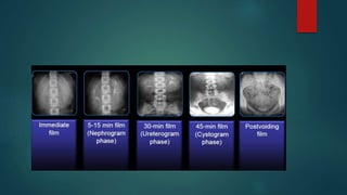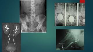 The document provides an overview of the anatomy and imaging techniques of the urinary tract. It describes the pelvicalyceal system including the minor and major calyces that drain into the renal pelvis. It notes the locations of the renal hilum and discusses the ureters, bladder, and urethra. Common congenital anomalies are described such as duplex collecting systems, ureteropelvic junction obstruction, megacalyces, and calyceal diverticula. Imaging modalities for evaluating the urinary tract include KUB, IVP, ultrasound, MRI, and urethrograms. Characteristic signs of conditions like papillary necrosis are also outlined.