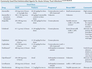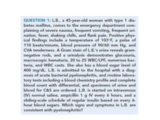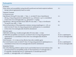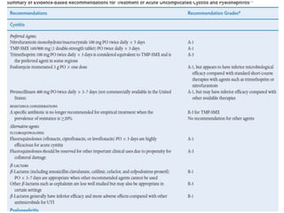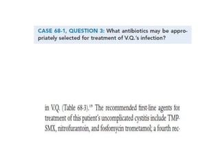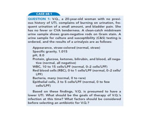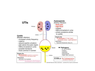 This document discusses urinary tract infections (UTIs). It covers the types of UTIs including cystitis (bladder infection) and pyelonephritis (kidney infection). It discusses risk factors for UTIs like female anatomy, sexual activity, pregnancy. It also discusses symptoms, diagnosis through urinalysis and culture, typical causative organisms like E. coli, and first-line antibiotic treatments like nitrofurantoin and TMP-SMX. Adverse drug reactions to these antibiotics including nausea, rash, and pulmonary toxicity are also summarized.