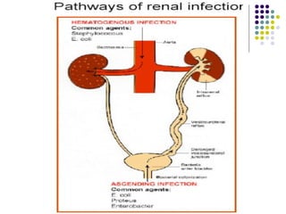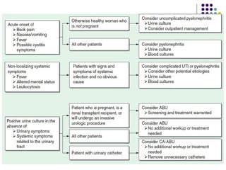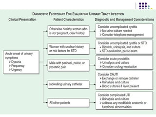 Urinary tract infections (UTIs) are very common, affecting around 150 million people worldwide each year. The majority are cystitis, with a smaller percentage being pyelonephritis. Risk factors include being female, as well as factors like urinary catheters and anatomical abnormalities. Escherichia coli is the most frequent cause of community-acquired UTIs. Diagnosis involves urinalysis, urine culture and sensitivity testing. Treatment consists of antibiotics targeting the identified organism. Recurrent UTIs may be prevented with low dose antibiotic prophylaxis.