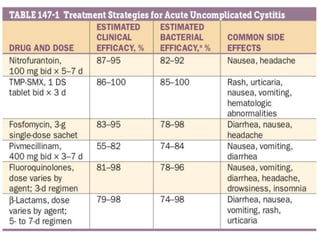 Urinary tract infections (UTIs) can be asymptomatic or symptomatic, affecting the bladder (cystitis) or kidneys (pyelonephritis). Escherichia coli is the most common cause of uncomplicated UTIs, while complicated UTIs involve other gram-negative rods or yeasts. Diagnosis involves urinalysis, urine culture, and symptom assessment. Treatment consists of short courses of antibiotics like nitrofurantoin, trimethoprim-sulfamethoxazole, or fluoroquinolones. Recurrent UTIs may be prevented with continuous or postcoital antibiotic prophylaxis.