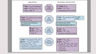 This document discusses the pathophysiology of unilateral ureteric obstruction. It describes three phases that occur with obstruction: 1) renal blood flow increases initially along with pressure, 2) pressure remains elevated but blood flow declines, 3) further declines in blood flow and decreases in pressure. The obstruction causes vasoconstriction that reduces blood flow and glomerular filtration rate over time. Microscopic changes include tubular dilation, fibrosis, inflammation and apoptosis leading to glomerulosclerosis and chronic inflammation. Clinical relevance includes risk of hypertension, proteinuria and declining renal function with loss of nephrons if obstruction is not relieved.