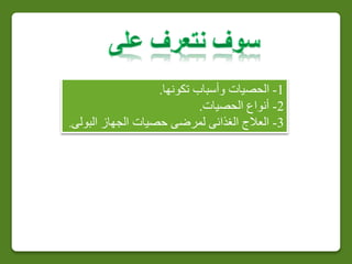 تتناول الوثيقة أنواع وأسباب حصيات الجهاز البولي، وتأثير العوامل الغذائية على تكوينها وعلاجها. تتضمن الاستراتيجيات المقترحة التعديل في النظام الغذائي وزيادة تناول السوائل لتقليل خطر تكوين حصيات الكلى. يستعرض النص أيضًا مكونات الحصيات المختلفة مثل حصيات الكالسيوم واليورك، وطرق التعرف على نوع الحصيات لعلاجها بشكل فعال.
