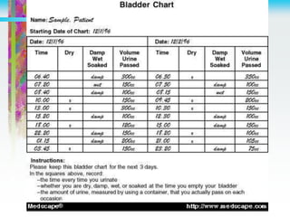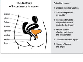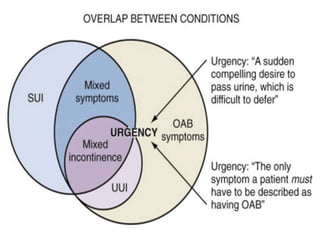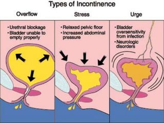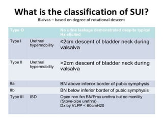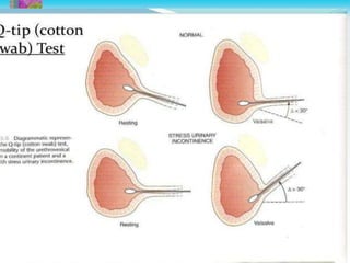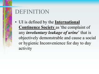 This document discusses urinary incontinence, including definitions, epidemiology, risk factors, types, evaluation, and treatment. It defines urinary incontinence as involuntary leakage of urine. Stress urinary incontinence is leakage that occurs with increases in abdominal pressure like coughing or sneezing. Evaluation involves history, physical exam, and may include tests like cystoscopy, urodynamics, and post-void residual measurement. Treatment depends on type of incontinence and severity.