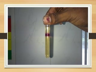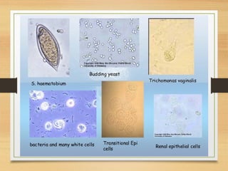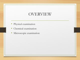 This document provides an overview of urine analysis including physical, chemical, and microscopic examination. Physical examination assesses volume, color, odor, pH, and specific gravity. Chemical examination tests for proteins, sugars, ketone bodies, bilirubin, and blood. Microscopic examination identifies epithelial cells, red blood cells, crystals, and casts which can indicate various conditions. Urine dipsticks provide a convenient qualitative analysis of various urine components. A comprehensive urine analysis evaluates kidney and bladder function and detects underlying diseases.