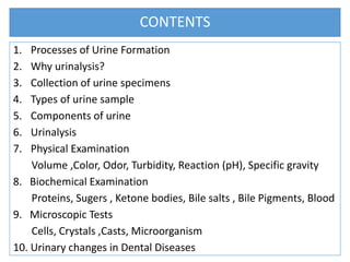 This document provides an overview of urine analysis in dentistry. It discusses the processes of urine formation, reasons for performing urinalysis, sample collection methods, and the components evaluated in a urinalysis. Physical examination assesses volume, color, odor, turbidity, pH, and specific gravity. Biochemical examination tests for proteins, sugars, ketone bodies, bile, and blood. Microscopic tests identify cells, crystals, casts, and microorganisms. Together these evaluations can help diagnose and monitor diseases affecting the kidneys, urinary tract, and other body systems.