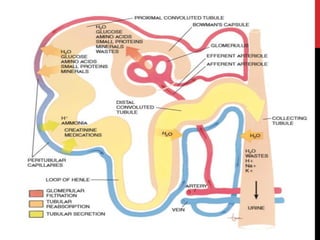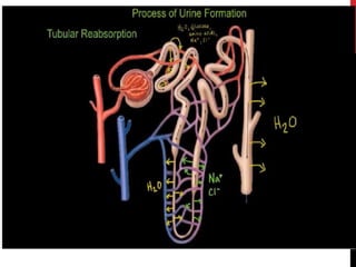 Urine analysis provides important information about kidney and metabolic function. A routine urinalysis includes physical, chemical, and microscopic examination of urine. The physical exam evaluates properties like color, clarity, specific gravity, and pH. The chemical exam checks for proteins, glucose, ketones, blood, and other substances. The microscopic exam identifies crystals, casts, epithelial cells, and other particles in the sediment. Abnormal findings can indicate conditions like urinary tract infections, kidney disease, or metabolic disorders.