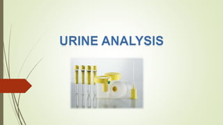 Urinalysis is one of the oldest medical laboratory procedures used to evaluate health and diagnose diseases. It involves physical, chemical, and microscopic examination of urine. The physical exam assesses characteristics like color, clarity, volume, odor, pH, and specific gravity. The chemical exam uses dipsticks to detect substances like protein, glucose, ketones, blood, and bilirubin. Microscopic analysis identifies cells, casts, crystals, and microorganisms in the sediment. Together these tests provide valuable information about the function of the kidneys and urinary tract.