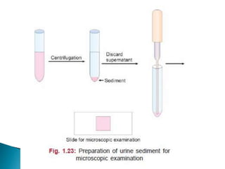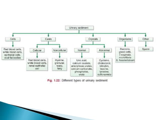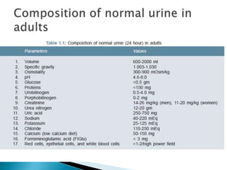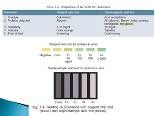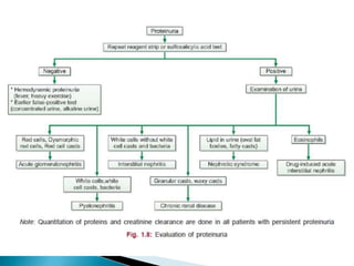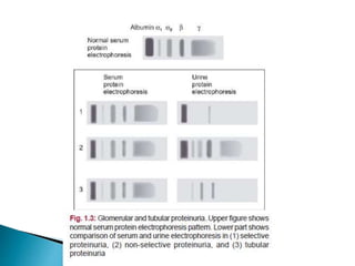 This document provides information on evaluating proteinuria in urine. It discusses the different types of proteinuria including glomerular, tubular, overflow and hemodynamic proteinuria. Glomerular proteinuria is caused by damage to the glomerular basement membrane and can be selective or non-selective. Tubular proteinuria occurs when low molecular weight proteins are excreted due to tubular damage. Tests for detecting and quantifying protein in urine include heat and acetic acid test, reagent strip, sulphosalicylic acid test, and 24-hour urine collection. The document provides normal ranges and indications for proteinuria testing.
