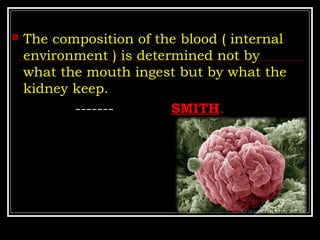 This document provides an overview of urine formation and glomerular filtration rate. It discusses the key parts of nephron involved including glomerulus, Bowman's capsule and different segments of nephron. The three main steps in urine formation are glomerular filtration, tubular reabsorption and tubular secretion. Glomerular filtration is the process by which plasma is filtered into Bowman's space to form primary urine. The rate of glomerular filtration is regulated by various factors like hydrostatic and oncotic pressures in the glomerular capillaries. Glomerular filtration rate can be measured by using clearance of substances like inulin, creatinine and urea that are freely filtered but neither re