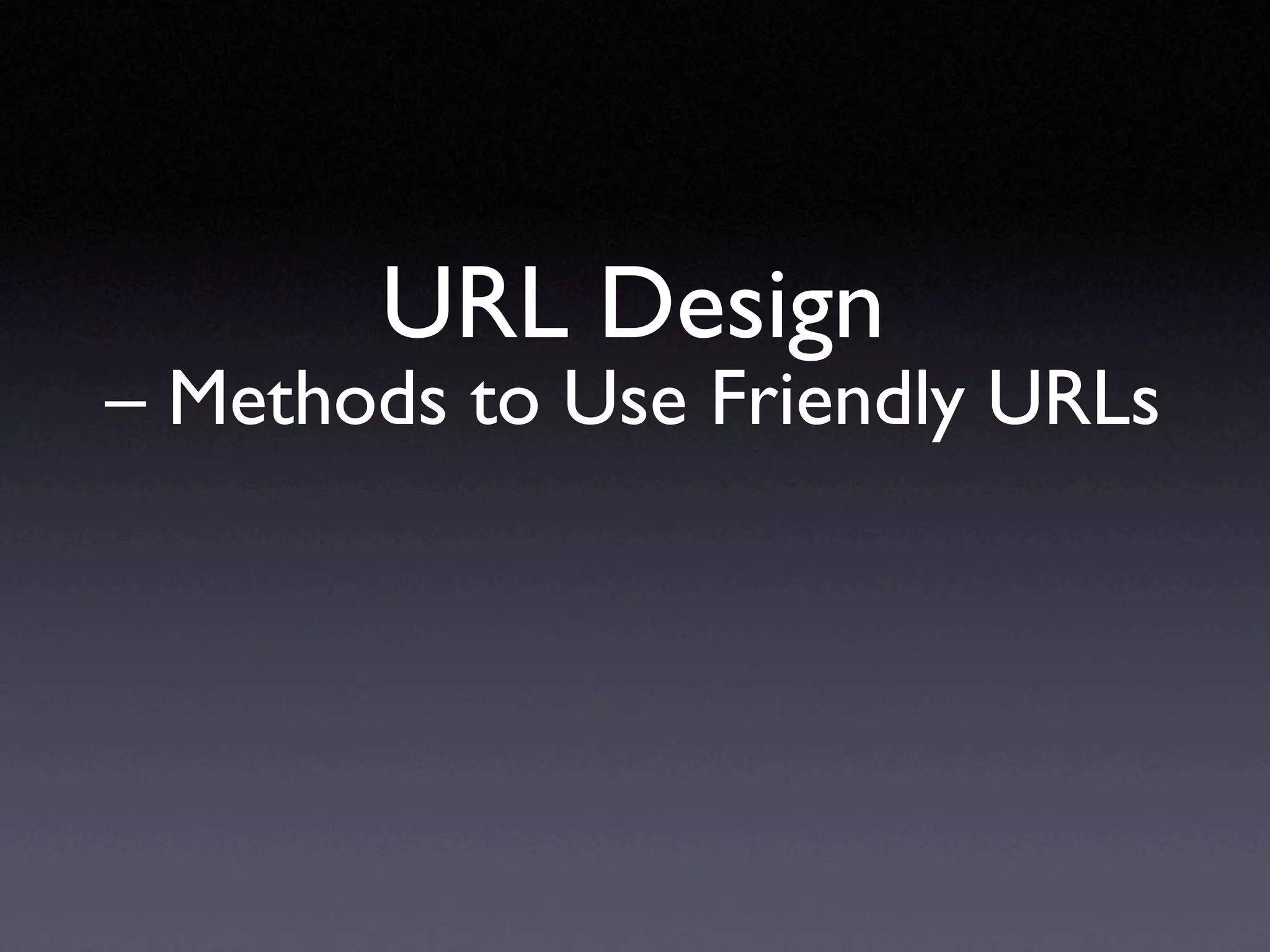 The document discusses methods for designing friendly URLs, emphasizing the importance of disconnecting URLs from the server's file system and creating user-friendly, memorable, and easily navigable URLs. It elaborates on URL mapping techniques using technologies like mod_rewrite and Lasso, alongside configuration guidelines for web servers. Additionally, it covers examples of how to implement URL handlers to improve request processing and user experience.
