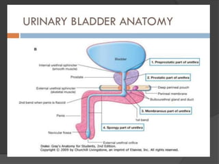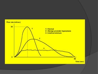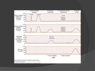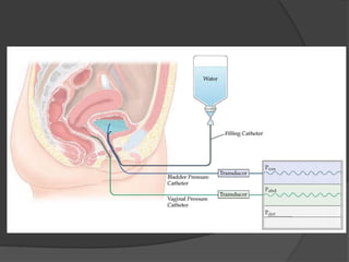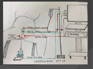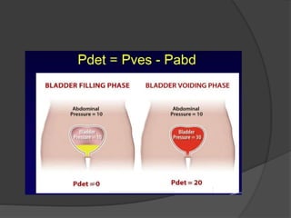 This document discusses urodynamics, which involves testing to evaluate lower urinary tract symptoms. It describes the components of a urodynamic study including uroflowmetry, cystometrography, and pressure flow study. Common indications for urodynamics include evaluating young males with untreated LUTS, neurogenic bladder issues, and mixed urinary incontinence. The document outlines the procedure, parameters evaluated, normal values, and how urodynamics can help guide appropriate treatment.