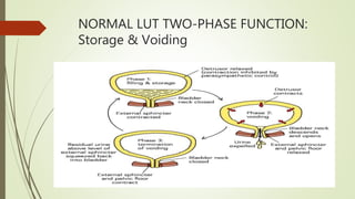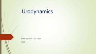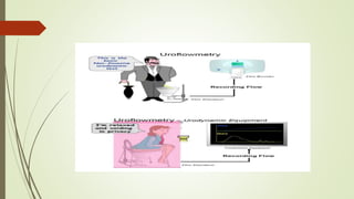 Urodynamics tests the storage and voiding functions of the lower urinary tract through various tests like cystometry, uroflowmetry, and pressure-flow studies. Cystometry measures pressure-volume relationships during bladder filling and looks at parameters like compliance, capacity, and detrusor activity. Uroflowmetry analyzes urine flow over time through variables like maximum flow rate and voiding time. Together these tests can characterize detrusor and outlet functions, diagnose neuropathies, and determine the cause of lower urinary tract symptoms when other evaluations are inconclusive. The tests are indicated for incontinence, outflow obstruction, neurogenic bladder dysfunction, and voiding problems in children.