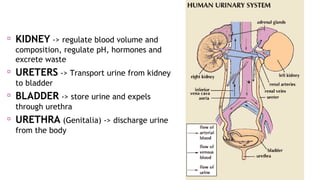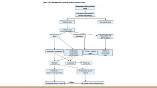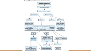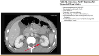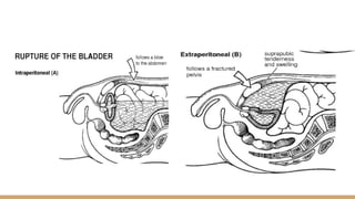 This document summarizes urogenital trauma, including the kidneys, ureters, bladder, and urethra. It notes that the kidneys are most commonly injured in blunt trauma from impacts with seatbelts or steering wheels. Bladder and posterior urethra injuries are often associated with pelvic fractures from blunt trauma. Evaluation of trauma involves examination for bruising, hematuria, and penetrating objects. Imaging like ultrasound, IVP, CT and cystography are used for diagnosis. Surgical management depends on the specific organ injured and degree of trauma.