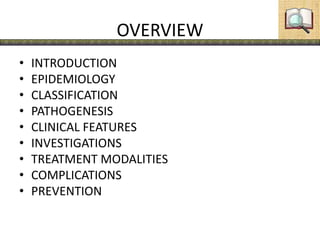 This document provides an overview of urolithiasis (kidney stones). It discusses the epidemiology, classification, pathogenesis, clinical features, investigations, treatment modalities, complications, and prevention of kidney stones. Treatment depends on the location and size of the stone and includes extracorporeal shock wave lithotripsy, percutaneous nephrolithotomy, ureteroscopy, and open surgery. The goal is to remove stones while minimizing complications such as infection, obstruction, and loss of renal function. Prevention focuses on adequate fluid intake, dietary modifications, and medical management for certain stone types.