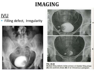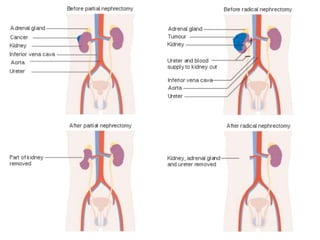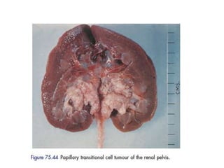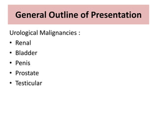 This document provides a comprehensive overview of urologic malignancies, focusing on various types such as renal, bladder, prostate, and penile cancers. It details classifications, clinical features, diagnostic workups, and treatment modalities for each cancer type, highlighting statistical data on incidence, prognosis, and therapeutic approaches including surgery, chemotherapy, and immunotherapy. The document emphasizes the importance of early detection and different staging systems used to assess the extent of these malignancies.
