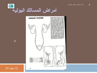 يتناول المستند موضوع أمراض المسالك البولية، مع التركيز على الالتهابات التي تصيب هذه المنطقة وأعراضها. يوضح الأعراض الشائعة مثل صعوبة التبول والبول الملون أو المعكر، ويشير إلى الأسباب المحتملة مثل البكتيريا. كما يتضمن تشخيص الأمراض وعلاجها، مع تقديم نصائح للوقاية.