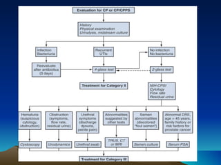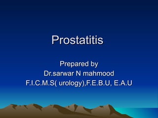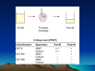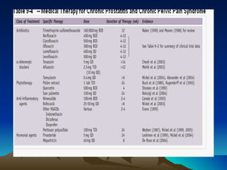 This document discusses different types of prostatitis, including acute bacterial prostatitis, chronic bacterial prostatitis, chronic pelvic pain syndrome, and prostate abscess. It describes the presentation, findings, diagnostic approach, and management for each condition. Chronic pelvic pain syndrome is further divided into inflammatory and noninflammatory subtypes based on cytological examination findings. While antibiotics may help certain types of prostatitis, treatment for chronic pelvic pain syndrome focuses on medications, physical therapies, and occasionally minimally invasive procedures to manage symptoms.