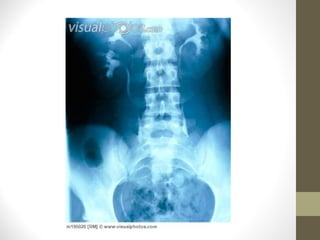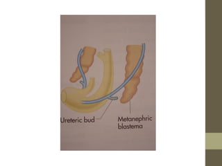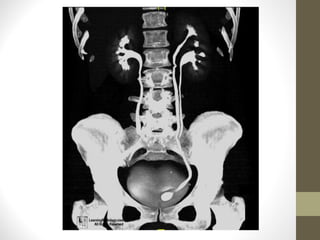 The document provides an overview of urinary tract anatomy and relevant pathologies. It begins with basic embryology of the urinary tract including the development of the kidneys, ureters, and bladder from the intermediate mesoderm. Key anatomical landmarks of the kidneys and ureters are described. Examples of pathologies discussed include duplex renal systems which can cause upper pole obstruction and hydronephrosis. PUJ obstruction is explained as a restriction of flow from the renal pelvis to ureter that can lead to renal deterioration if left untreated. Renal calculi cause pain when they obstruct the urinary tract at various positions from the infundibulum to the VUJ.