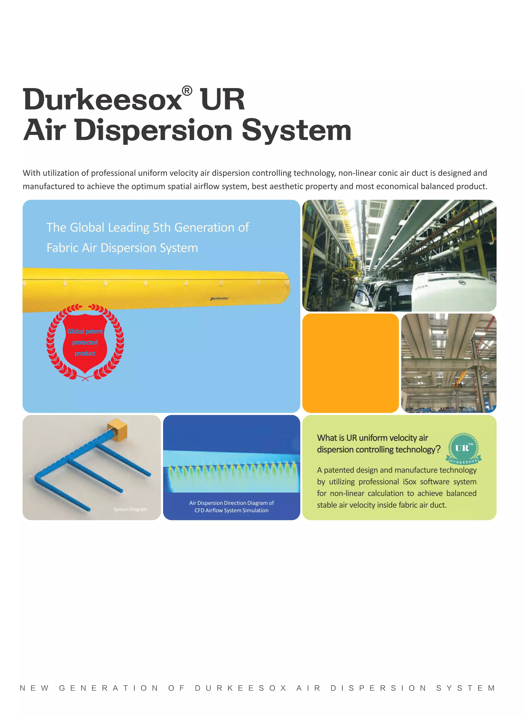 1. The document introduces the UR air dispersion system, the fifth generation of fabric air dispersion system from Durkeesox.
