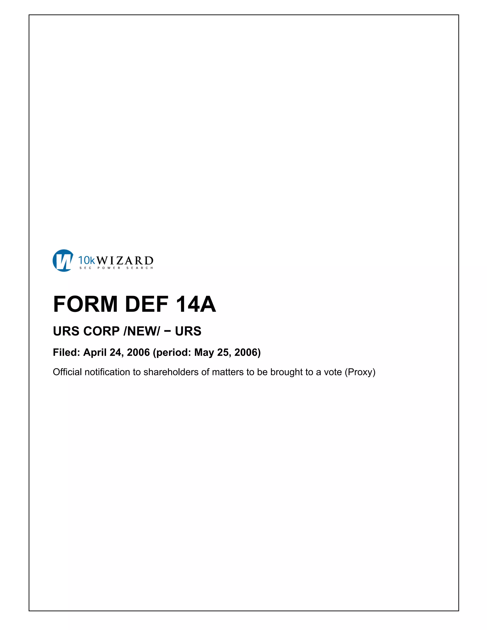 The document is URS Corporation's proxy statement for its 2006 annual meeting of shareholders. It provides information about matters to be voted on at the meeting, including the election of directors, an amendment to the company's equity incentive plan, and a shareholder proposal regarding majority voting. It also provides information about URS Corporation's board of directors, executive compensation, voting procedures, and other standard annual meeting topics.
