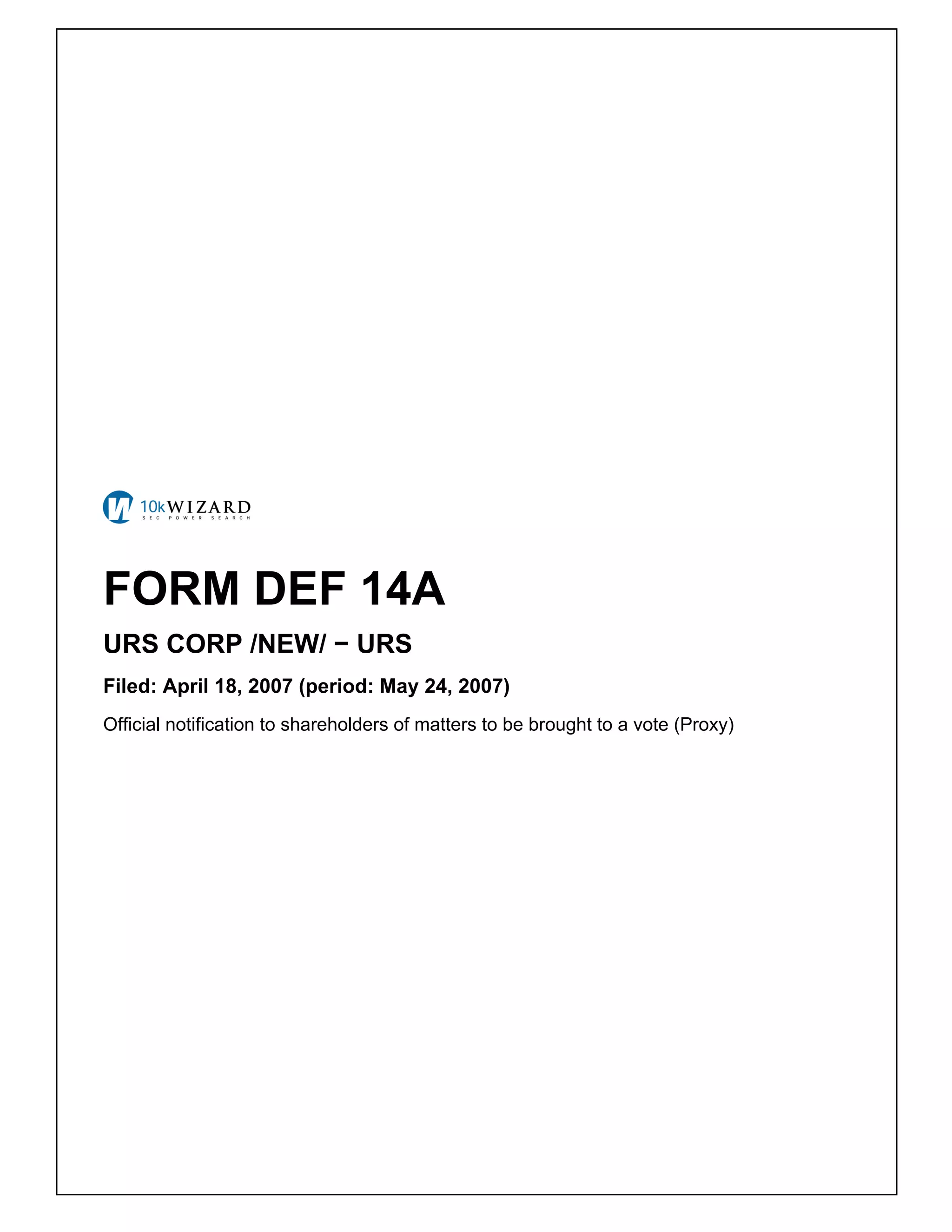 This document is a proxy statement from URS Corporation providing notice of its 2007 Annual Meeting of Shareholders. It summarizes the business to be conducted including electing directors and ratifying the selection of the independent accounting firm. It provides details on voting procedures, recommendations of the board, and requirements for stockholder proposals for the next annual meeting.