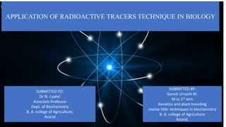 The document discusses the application of radioactive tracers in biology. It provides details on how radioactive tracers work by giving off detectable particles that can be used to create images of organs and structures in the body. The document then discusses specific applications of radioactive tracers in metabolism research, medicine, hydraulic fracturing, and imaging techniques like PET scans. It also discusses how tracers can be used to study isolated organs/tissues, mutant strains of microorganisms, and track biochemical pathways.