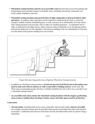 The Americans with Disabilities Act (ADA) requires that new stadiums provide equal access for people with disabilities to enjoy entertainment events. Key requirements include wheelchair accessible seating that is dispersed throughout the stadium in all viewing areas. Accessible routes must connect all public areas like concessions and restrooms. When audio is important, assistive listening systems are required. Accessible parking, drop-off areas, entrances, signs, and other features are also mandated. For more details on stadium accessibility under the ADA, contact the Department of Justice.