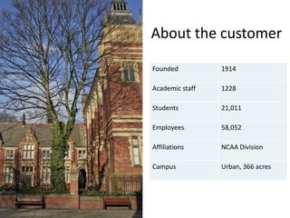 The document discusses the requirements of a university customer with over 58,000 employees and 21,000 students. The university needed to monitor its network across multiple operating systems, ensure high availability, prioritize bandwidth for educational applications, and monitor collaborative applications. ManageEngine OpManager fulfilled these requirements with a centralized monitoring console, visibility into physical and virtual servers, network traffic analysis, uptime monitoring, and configuration management.