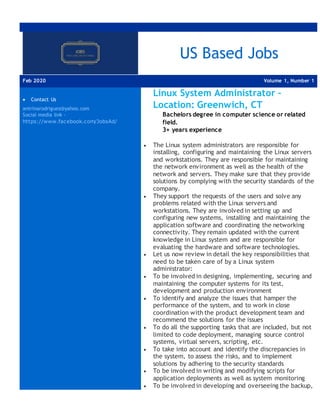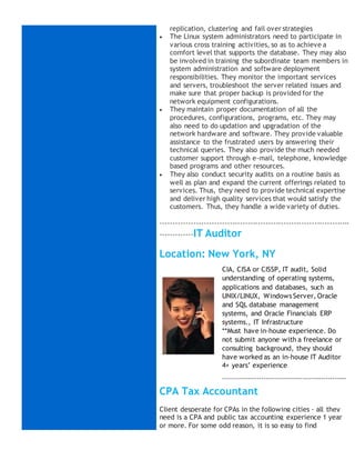 The document lists various job openings in the US across different fields, including Linux System Administrator, IT Auditor, CPA Tax Accountant, Software Engineer, and more, detailing the required qualifications and responsibilities for each position. It outlines the educational background, experience needed, and specific skills related to each job category. Additionally, it emphasizes the demand for specific roles such as CPAs, while also providing insight into remote work options for certain positions.