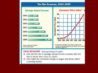 The document summarizes the key causes and events of World War I, including nationalism, imperialism, militarism, and the alliance system that divided Europe. It describes the assassination of Archduke Franz Ferdinand leading Austria-Hungary to declare war on Serbia, pulling the other European powers into war. The fighting involved trench warfare and major battles like Tannenberg, Ypres, Gallipoli, Verdun, and the Somme. Though the US tried to remain neutral, German actions like unrestricted submarine warfare and the Zimmerman Telegram turned American public opinion against them and led the US to declare war in 1917.